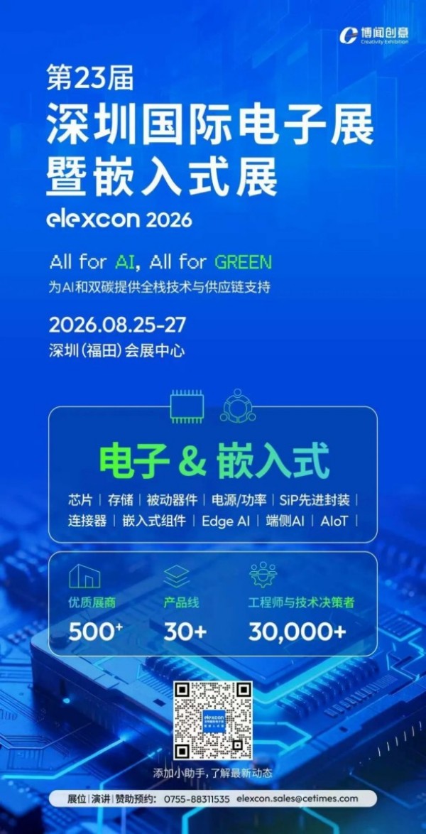 elexcon将于2026年8月25至27日在深圳会展中心举办elexcon2026第二十三届深圳国际电子展暨嵌入式展,链接行业顶级资源,全面呈现AI终端创新技术新品及方案。