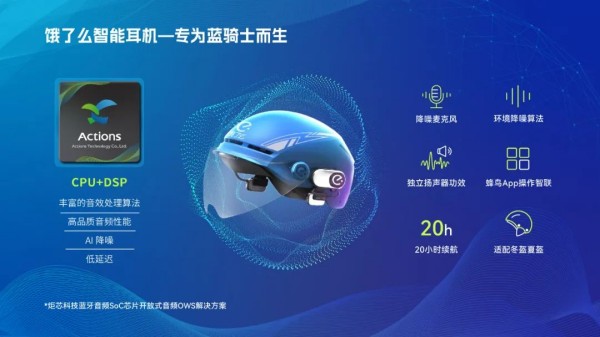不久前,饿了么蓝骑士公布了一款智能头盔耳机产品,目前已在蜂鸟APP-装备商城、金币商城发售。饿了么智能耳机采用了炬芯®蓝牙音频SoC芯片。该耳机产品通过“双麦阵列+环境降噪算法”的优化设计,有效滤除骑...